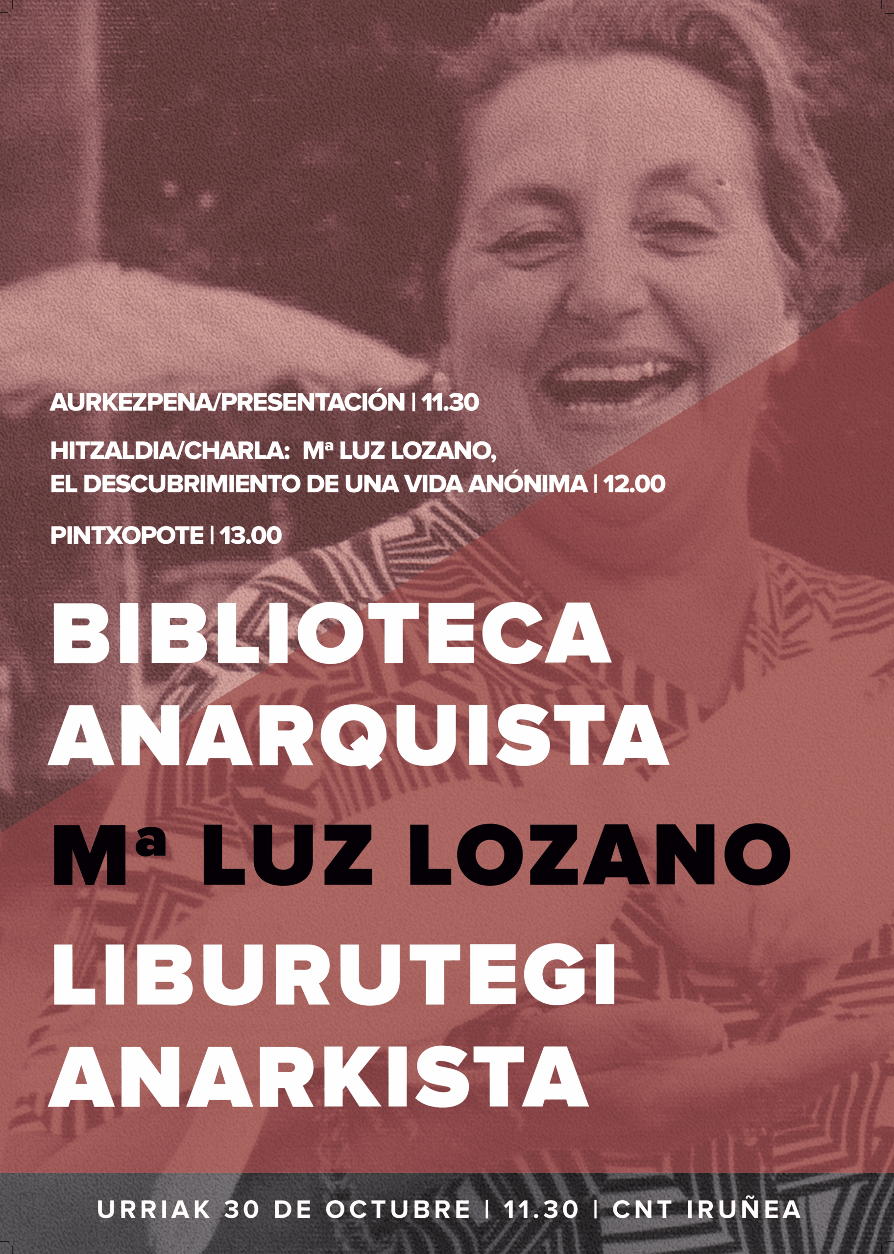 Mari Luz Lozano, nacida en Sangüesa en 1913, fue una incansable luchadora antifascista que sufrió de primera mano la represión tras el levantamiento de 1936. Su extensa, a la vez que desconocida y apasionante biografía será comentada en el acto por sus familiares y compañerxs cenetistas. El acto, abierto a todo el público, se celebrará en la sede de CNT Iruñea, calle Hilarión Eslava 11 a las 11:30 horas.