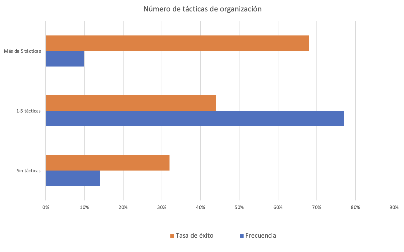 El estudio también agrupó las campañas en aquellas que no tenían tácticas, de 1 a 5 tácticas y más de 5. El gráfico siguiente muestra, como es lógico, que el porcentaje de victorias aumenta drásticamente a medida que aumenta el número de tácticas. Sorprendentemente, las campañas sin tácticas seguían teniendo un porcentaje de victorias del 32%. Lo que resulta preocupante es que sólo el 10% de las campañas utilizaron más de 5 tácticas, aunque el porcentaje de victorias superó los 2/3 de las mismas. La gran mayoría de las campañas utilizaron de 1 a 5 tácticas, con un porcentaje de victorias inferior al 50%.