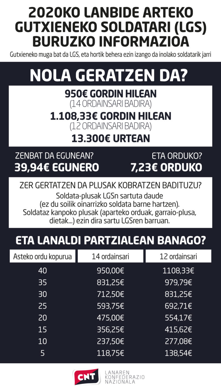 LGSa 950 euro gordinera igo da, urtarrilaren amaieran iragarri zen bezala. Horregatik, sindikatutik eskema bat egin da eragindako langileek beren egoera berria zein den argiago izan dezaten. Zalantzarik izanez gero, sindikatutik pasa zaitez.