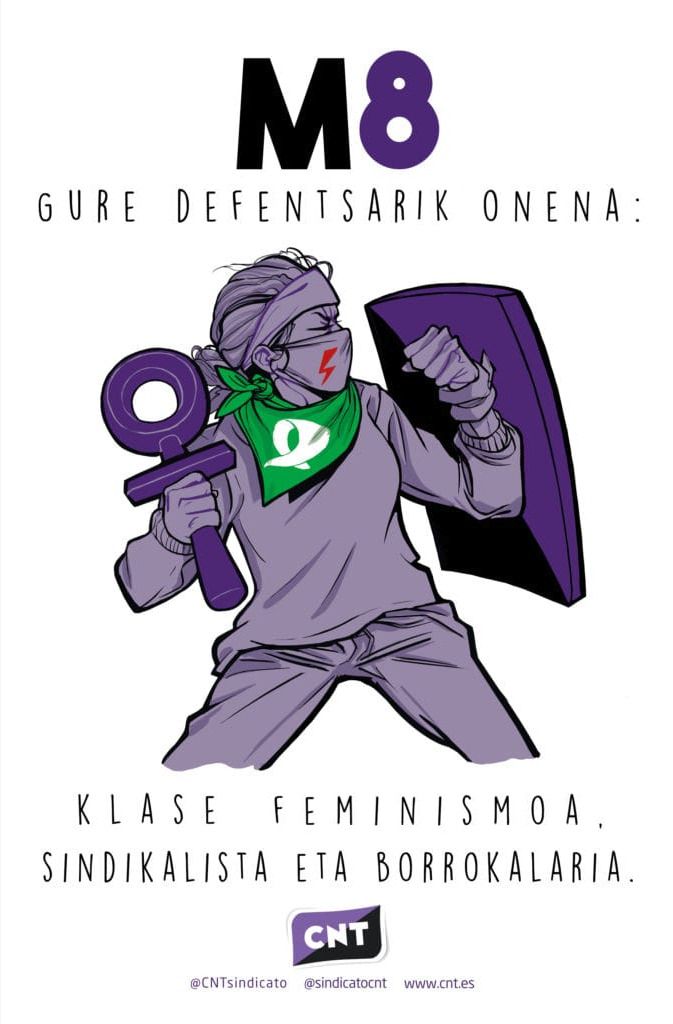 Hau guztiagatik, garrantzitsua da gogoraraztea Martxoaren 8 hau, urteko egun guztietan bezala, sindikalismo borrokalaria, CNTn, borroka egin dezakegula klaseko feminismotik, etengabe eta iraunkor. Horregatik, guk ikasten, militatzen eta eredu izaten jarraitu behar dugu gure sindikatuetan, beste emakume batzuk trebatzen, kide gehiago aldaketaren parte izatera animatzen, denak partaide izaten eta gure gaitasunak mahai gainean jarriz.