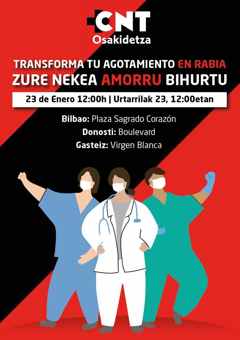 Osakidetzako CNTren sail sindikalak ere, mobilizazioetan aktiboki parte hartu duenak, EAJk osasungintzan duen politika salatu du, lehen mailako arretako eta etengabeko arretako zentroak itxiz eta irekita dauden inbertsioak murriztuz, Osakidetzako langile-politika bezala, kontratazioak saihestuz, profesionaltasunaz eta langileen entregaz etengabe abusatuz, gero eta nekatuago eta desengainatuago baitago.Dei egiten diegu langileei mobilizazio-ildo horretan jarrai dezaten, erabiltzaileengana zabal ditzaten eta, gurekin batera, amaiera eman diezaioten osasun publikoari eta Osakidetzari etengabe eta interesatuta egiten zaion eraso honi.