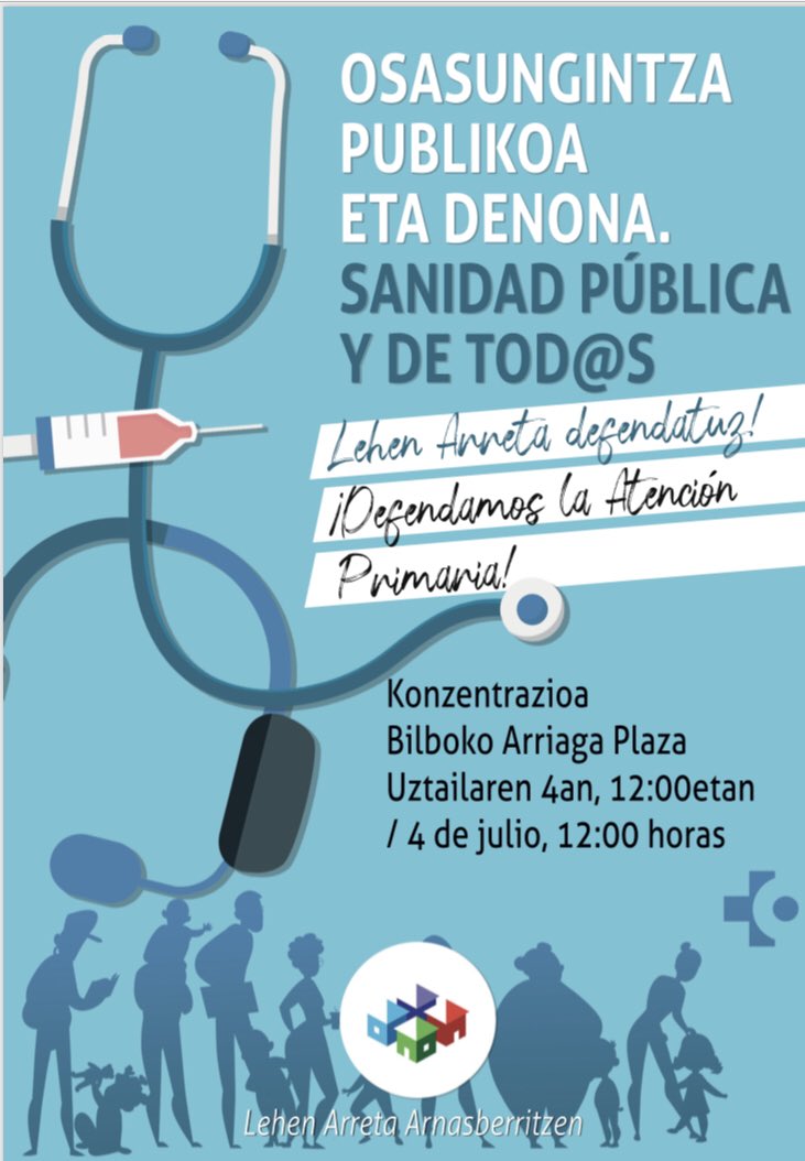 CNT Osakidetzak bat egin du Lehen Arreta Arnasberritzenek datorren larunbatean, uztailak 4, Bilboko Arriaga plazan egingo duen kontzentrazioarekin. CNTk Osakidetzan duen atal sindikalak afiliatu eta jarraitzaile guztiei dei egiten die osasun publikoaren aldeko deialdi honetara eta gainerakoetara joateko.