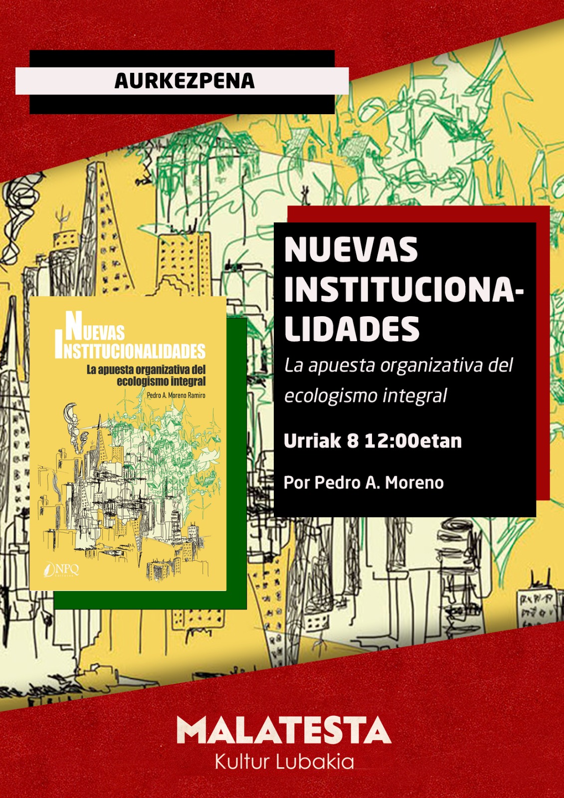 Patricia Rapson eta Kepa Añibarro, Berpiztu Permakultura proiektukoak, ekosistema eta permakultura birsortzeari buruz mintzatuko dira asteazkenean, hilak 5, 19:30ean. Ostegunean, hilak 6, ordu berean, Kidekoop kontsumo-kooperatibak bere proiektua azalduko du, elikadura- eta kontsumo-subiranotasunaz hitz egiteaz gain Bilbon. Eta zikloari amaiera emateko, larunbatean, hilak 8, eguerdiko 12:00etan, Pedro A. Morenok Nuevas Institucionalidades. La apuesta organizativa del Ecologismo Integral liburua aurkeztuko du, gure ekosistemak ez kolapsatzeko, langileen bizitza duintzeko eta herrietako kultura babesteko ezkerrera gero eta tarte gutxiago geratzen dela azpimarratu nahi duena.
